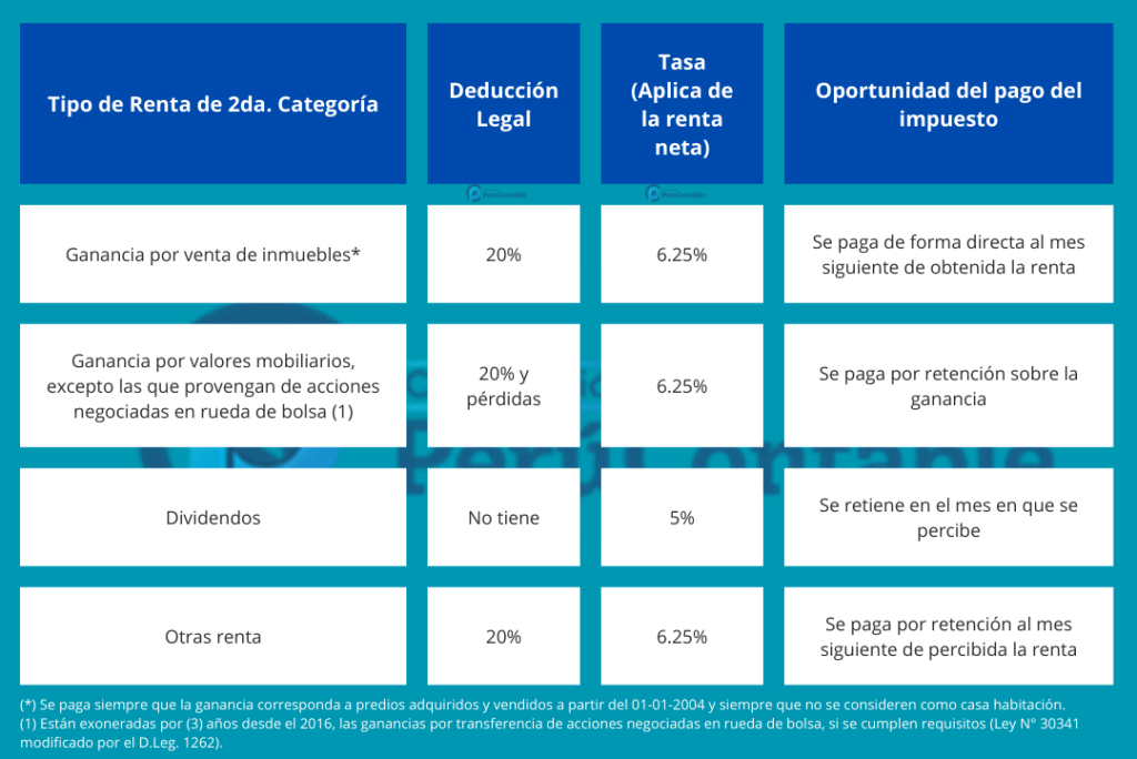 La renta de segunda categoría se refiere básicamente a los ingresos derivados del capital. Estos incluyen, los intereses, las regalías y las ganancias de capital. Dichos ingresos están sujetos a impuestos y deben ser declarados adecuadamente a la Administración Tributaria. En este artículo trataremos sobre cuales son las tasas a aplicar y los pasos que se tiene que seguir para obtener el impuesto a pagar.