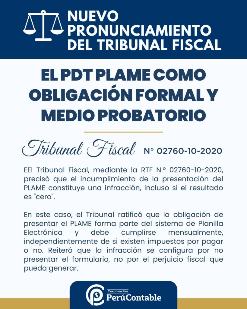 El Tribunal Fiscal, con la RTF N° 02760-10-2020, ha dejado claro que el PLAME es una obligación formal que debe cumplirse mensualmente, sin importar si hay empleados activos o impuestos por pagar. No presentar el PLAME, aunque sea “cero”, constituye una infracción tributaria que puede resultar en multas y sanciones por parte de SUNAT.