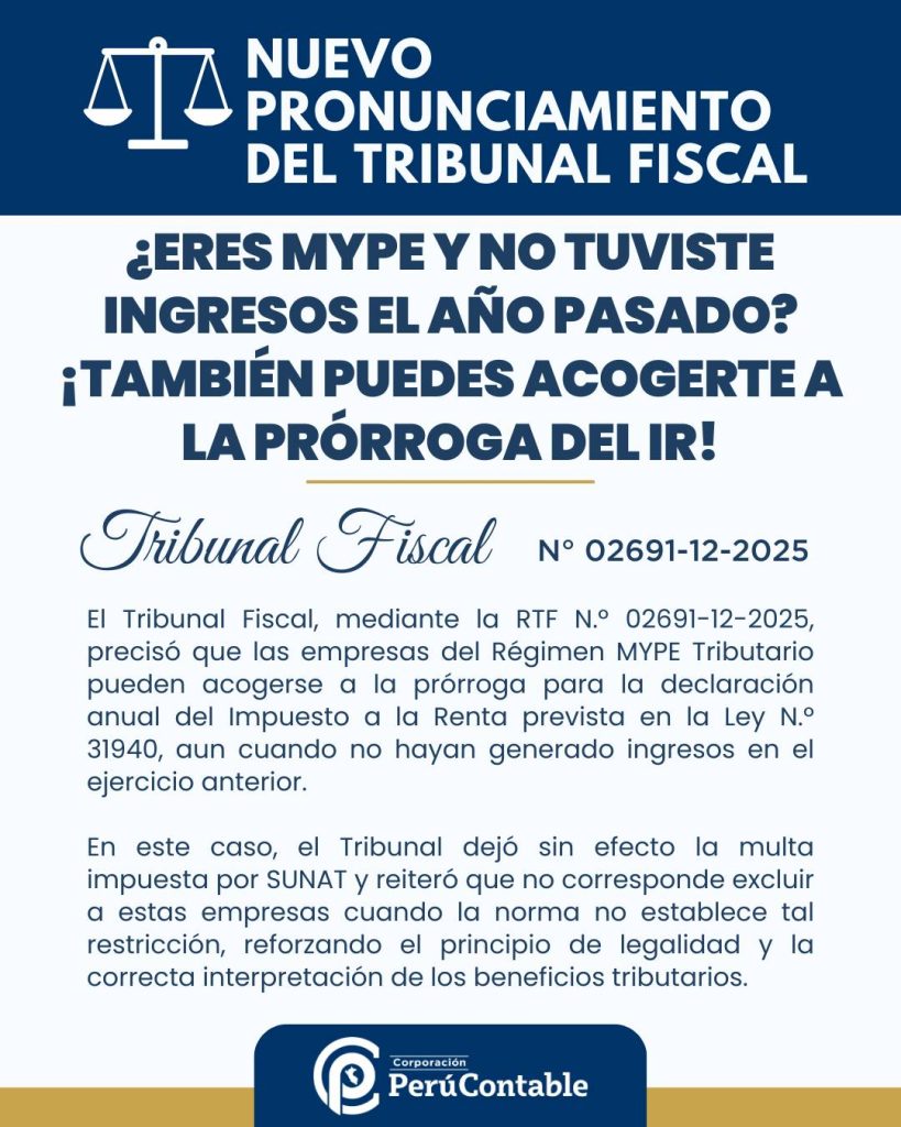 Recientemente, el Tribunal Fiscal de Perú ha emitido una resolución clave para miles de micro y pequeñas empresas (MYPE) que iniciaron sus actividades en el último año, pero no generaron ingresos. La Resolución N.º 02691-12-2025 aclara que las MYPE que no tuvieron ingresos el año pasado sí pueden acogerse a la prórroga del Impuesto a la Renta (IR) prevista por la Ley N.º 31940, contradiciendo la postura inicial de la SUNAT.