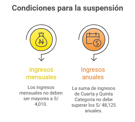La suspensión permite que no se aplique la retención del 8% del Impuesto a la Renta en los Recibos por Honorarios, siempre que el contribuyente cumpla los requisitos y no supere los límites de ingresos establecidos.