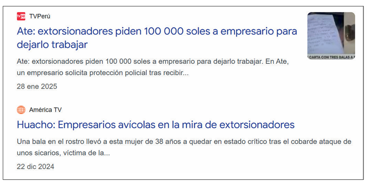 En los últimos años el delito de extorsión se ha consolidado como uno de los principales problemas que afecta la seguridad en el Perú. La extorsión constituye una seria amenaza para la economía peruana, pequeñas y medianas empresas se ven obligadas a pagar cuotas de protección para poder operar sin ser víctimas de violencia o destrucción de sus bienes. Este fenómeno reduce la rentabilidad de los negocios, promueve el cierre de locales y desalienta la inversión privada. Según datos del Ministerio del Interior (2024), las denuncias por extorsión aumentaron en más del 50 % en comparación con el año anterior, especialmente en las regiones de La Libertad, Lambayeque, Lima y Piura.