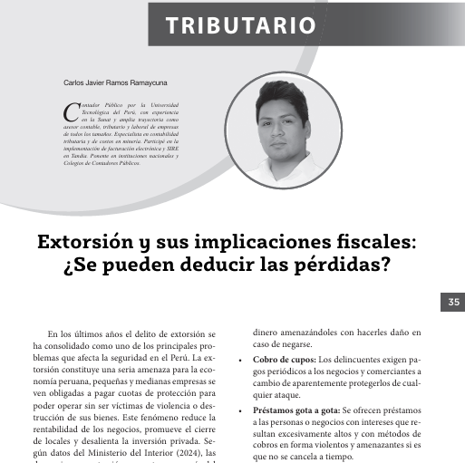 Bajo ese supuesto, cabe la posibilidad de que las pérdidas a causa del delito de extorsión sean deducibles, no obstante, la fi gura de la prueba judicial se vuelve un poco temeraria para algunos empresarios, puesto que, temen que haya represalias contra ellos, aunque si bien se han puesto canales de denuncias anónimas estos aun no resultan eficientes. Sin embargo, tal como se encuentra […].