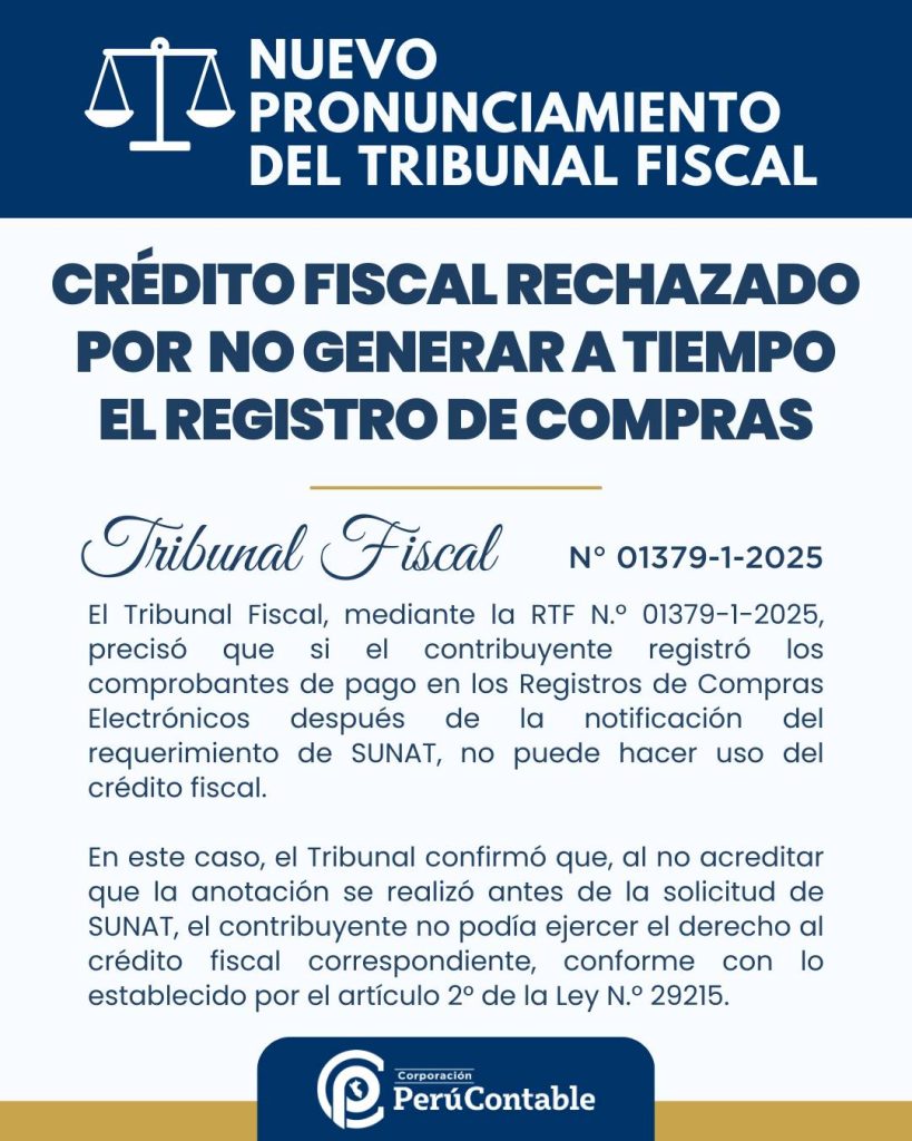 En ese contexto, el Tribunal Fiscal, mediante la RTF N.º 01379-1-2025, ha establecido un criterio relevante: no procede el uso del crédito fiscal cuando el Registro de Compras electrónico se genera con posterioridad a la notificación de un requerimiento de SUNAT.