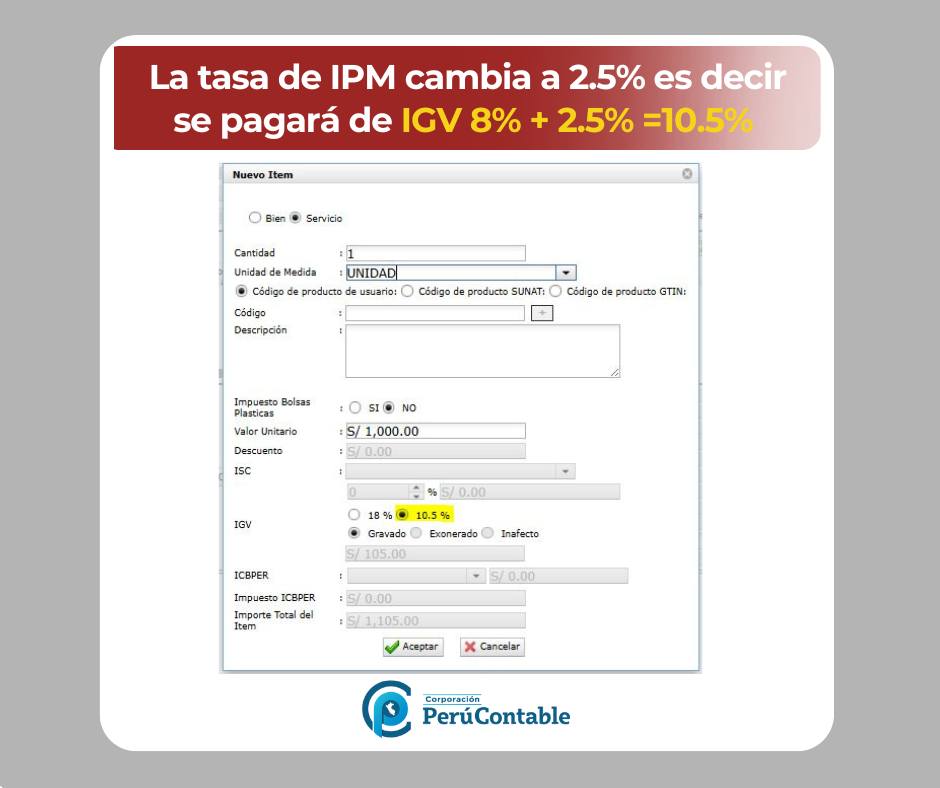 Este cambio responde al incremento progresivo del Impuesto de Promoción Municipal (IPM), establecido por la Ley N.º 32387, y ya ha sido implementado en el sistema de emisión de comprobantes electrónicos de la SUNAT.