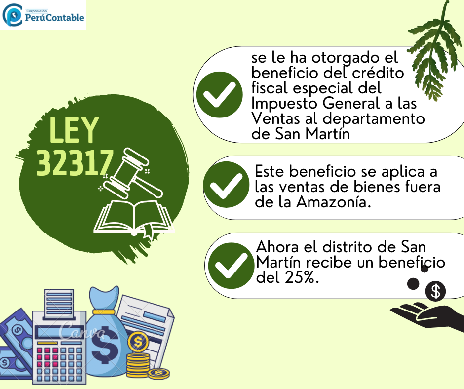 Este beneficio se aplica a las ventas de bienes fuera de la Amazonía. En Loreto, Madre de Dios y algunas áreas de Ucayali, el crédito fiscal especial es del 50% según la Ley N° 32317. San Martín, que había sido excluida, ahora recibe un beneficio del 25%.
