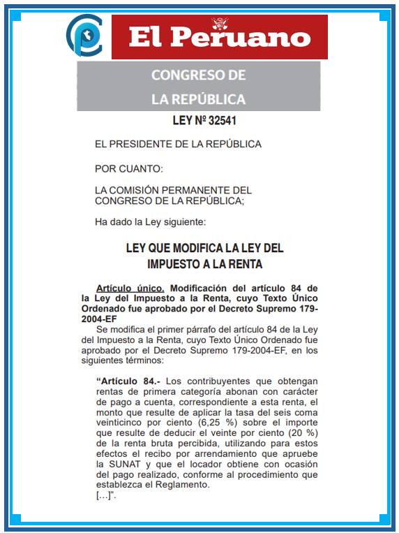 La Ley N.º 32541 introduce un cambio específico al Artículo 84 de la Ley del Impuesto a la Renta, el cual regula cómo se realiza el cálculo y pago a cuenta del impuesto sobre las rentas de primera categoría.