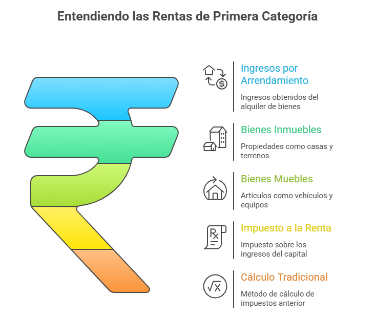 Las rentas de primera categoría corresponden a los ingresos que obtiene un contribuyente por el arrendamiento o subarrendamiento de bienes, ya sean inmuebles (como casas, departamentos, cocheras o terrenos) o bienes muebles (como vehículos o equipos) dentro del territorio peruano. Este tipo de rentas forma parte del impuesto a la renta bajo el rubro de rentas del capital.