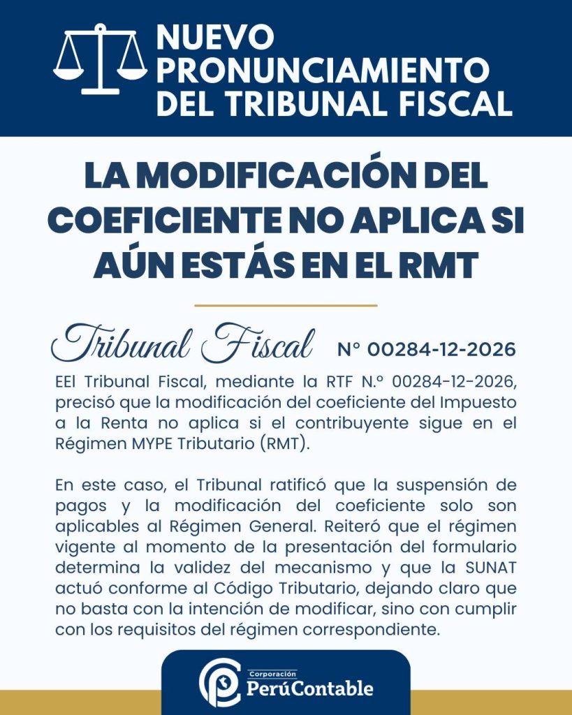El Tribunal Fiscal acaba de emitir un criterio clave sobre los pagos a cuenta del Impuesto a la Renta en el contexto del Régimen MYPE Tributario (RMT). En la RTF N° 00284-12-2026, el Tribunal dejó claro que la modificación del coeficiente bajo el artículo 85° de la Ley del Impuesto a la Renta (LIR) no es aplicable a los contribuyentes que permanecen en el RMT, independientemente de si presentan el formulario PDT 625 para solicitar la modificación.