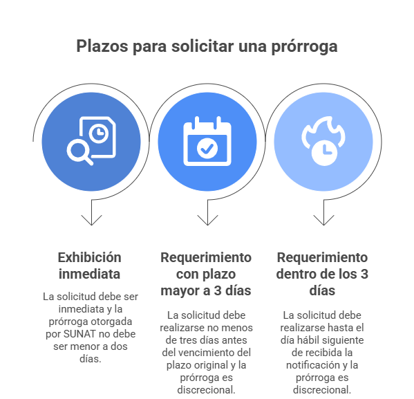 El Reglamento distingue diferentes escenarios según el tipo de requerimiento y el tiempo otorgado inicialmente. De manera general, los plazos para solicitar una prórroga son los siguientes: