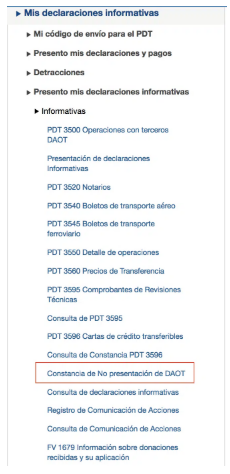 Luego nos dirigimos al menú Mis declaraciones informativas e ingresamos a la opción Constancia de No presentación del DAOT.