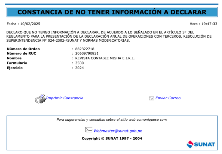 Finalmente, obtendremos nuestra CONSTANCIA DE NO TENER INFORMACIÓN A DECLARAR.