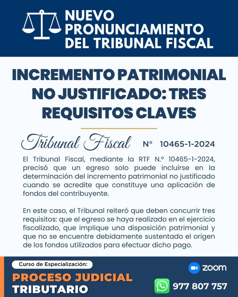 El Tribunal Fiscal (TF) ha emitido recientemente un criterio clave en la RTF 10465-1-2024, aclarando los requisitos para que un egreso sea considerado en la determinación del incremento patrimonial no justificado. Este pronunciamiento establece que, para que un egreso o gasto sea incluido en el cálculo de un incremento patrimonial no justificado, se deben cumplir tres condiciones fundamentales.