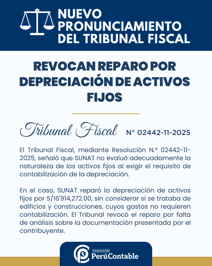 En la Resolución N.º 02442-11-2025, el Tribunal Fiscal abordó un asunto clave en materia tributaria relacionado con la deducción de la depreciación de activos fijos en el contexto del Impuesto a la Renta. El caso involucra a un contribuyente que fue fiscalizado por SUNAT, quien reparó la depreciación deducida en el ejercicio 2020 debido a la falta de contabilización de dicho gasto en el Registro de Activos Fijos, el cual fue legalizado fuera del plazo previsto, en 2022. Esta fiscalización resultó en un reparo de S/16’914,272.00.