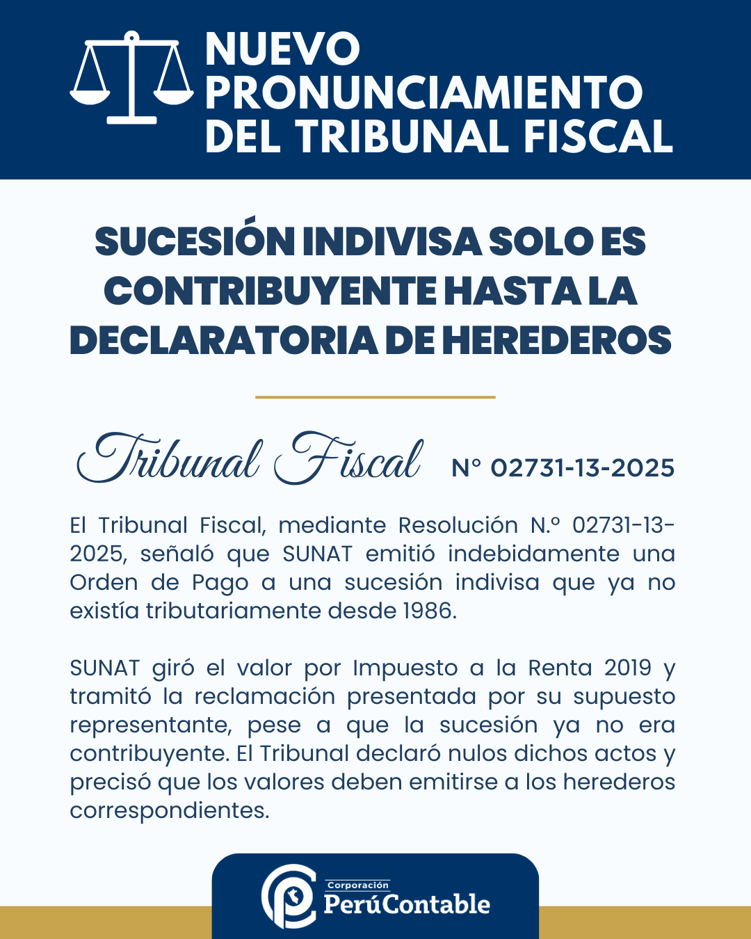 La Resolución del Tribunal Fiscal N.º 02731-13-2025 constituye un precedente importante en materia de fiscalización y determinación tributaria respecto de las sucesiones indivisas. Este pronunciamiento aclara los límites temporales de su existencia como contribuyentes y reafirma la obligación de la Administración Tributaria de identificar adecuadamente al sujeto pasivo antes de emitir cualquier valor o acto administrativo.