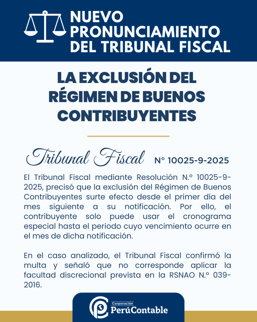 La Resolución del Tribunal Fiscal Nº 10025-9-2025 establece criterios relevantes sobre la oportunidad en que surte efecto la exclusión del Régimen de Buenos Contribuyentes y las consecuencias de utilizar indebidamente el cronograma especial de vencimientos.