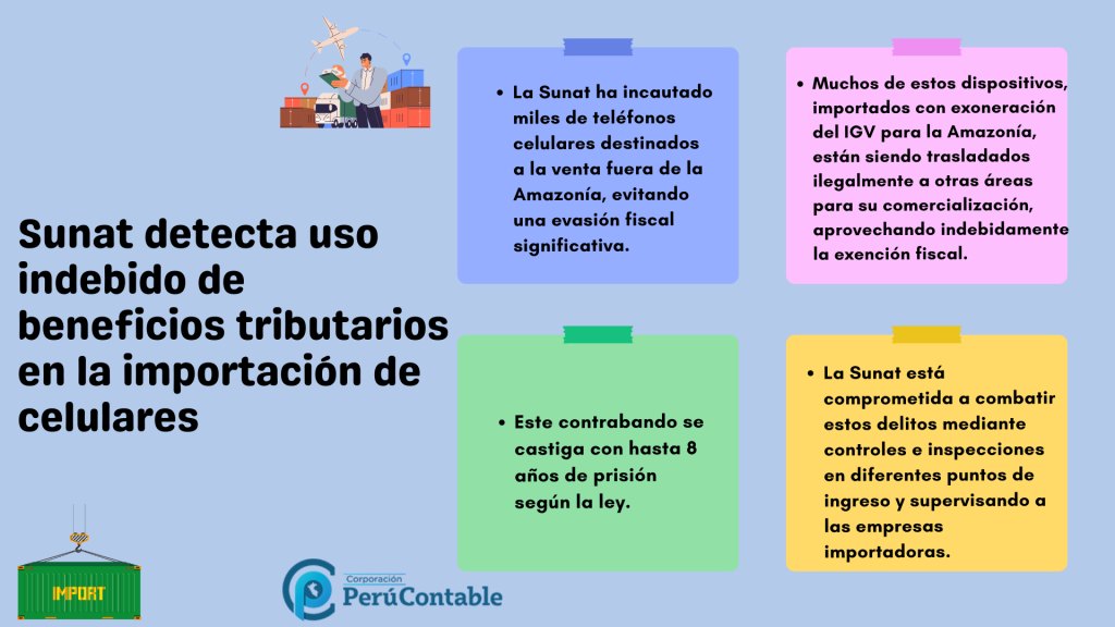 La Superintendencia Nacional de Aduanas y de Administración Tributaria (Sunat) confiscó más de 12 mil teléfonos celulares destinados a la venta en áreas que no pertenecen a la Amazonía. Estos dispositivos tenían un valor CIF que superaba los 8 millones de soles, lo que implicaba una evasión indebida de más de 1.5 millones de soles en concepto de Impuesto General a las Ventas (IGV). En lo que va del año actual, ya se han decomisado más de 2 mil teléfonos móviles. Conoce más aquí.