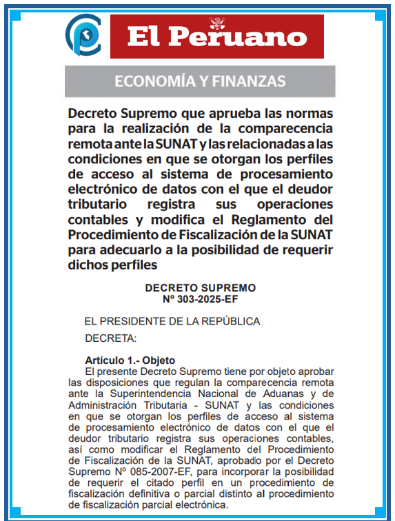 El 17 de diciembre de 2025 se publicó el Decreto Supremo N.º 303-2025-EF, mediante el cual se aprueban las normas para la comparecencia remota ante la SUNAT y se regulan las condiciones en que el deudor tributario debe otorgar perfiles de acceso a su sistema contable, modificándose además el Reglamento del Procedimiento de Fiscalización.
