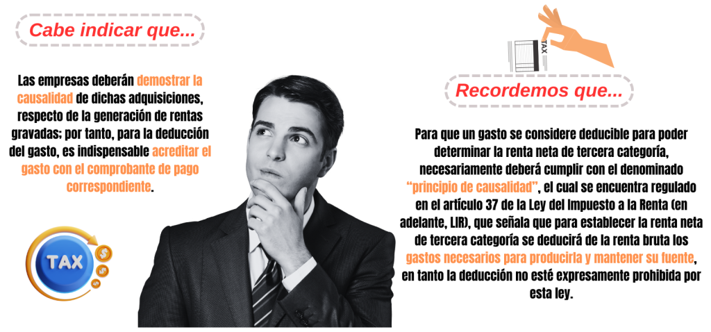 (1) Cabe indicar que las empresas deberán demostrar la causalidad de dichas adquisiciones, respecto de la generación de rentas gravadas; por tanto, para la deducción del gasto, es indispensable acreditar el gasto con el comprobante de pago correspondiente.