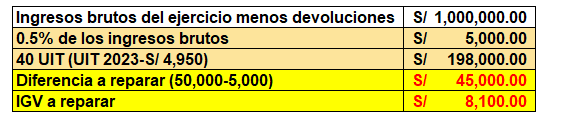 Es asi que, se deducirán S/5,000 y se adicionará en la DJ Anual los S/45,000 de exceso. Del mismo modo se tiene que reparar el IGV, ya que no se esta cumpliendo con el requisito sustancial – Artículo 18 del TUO del IGV, esto último conlleva a rectificar él declara fácil.