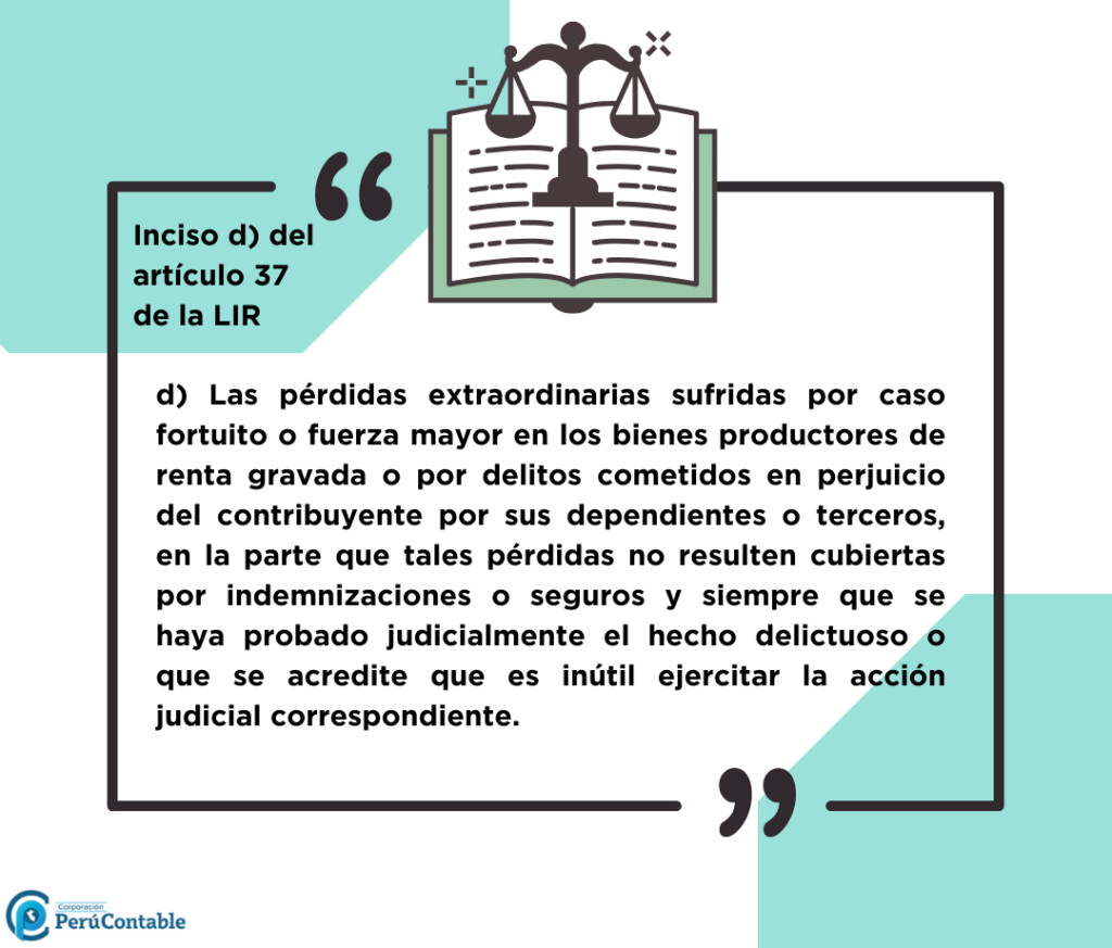 Las pérdidas extraordinarias sufridas por caso fortuito o fuerza mayor en los bienes productores de renta gravada o por delitos cometidos en perjuicio del contribuyente por sus dependientes o terceros, en la parte que tales pérdidas no resulten cubiertas por indemnizaciones o seguros, se deducirán en el ejercicio en que se devenguen, para lo cual se debe tener en cuenta cuándo: