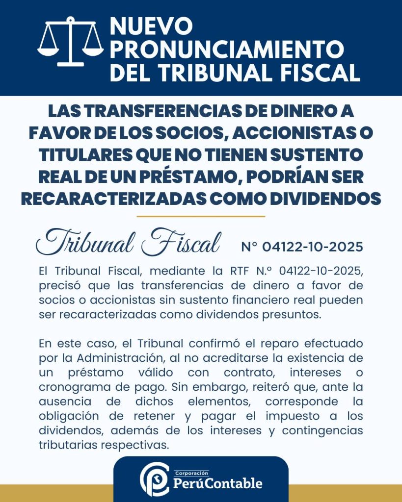 El Tribunal Fiscal, mediante la RTF 04122-10-2025, precisó que las transferencias de dinero realizadas por las empresas a favor de sus socios, accionistas o titulares, sin que haya un sustento real de préstamo, podrían ser recaracterizadas como dividendos. Este pronunciamiento de la Administración Tributaria tiene grandes implicancias para las operaciones financieras entre empresas y sus accionistas, ya que recalifica ciertos pagos que originalmente se consideraban como préstamos o adelantos.